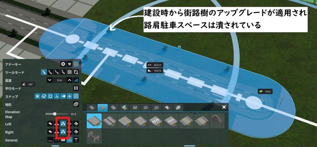 歩道の追加」「草地の追加」「街路樹の追加」はそれぞれ路肩の駐車スペースを潰して追加される。路駐をすべて排除したい場合には非常に有効