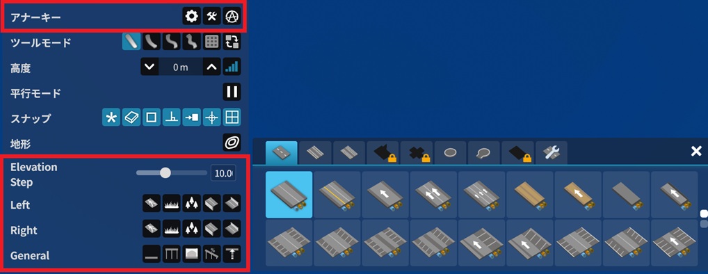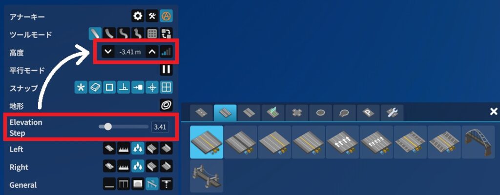 高度上限撤廃」モードにすると、道路を建設できる高さが 1,000m ~ -1,000m に変更される。