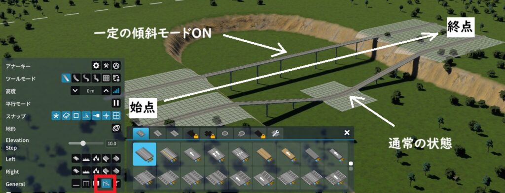 一定の傾斜」モードをオンにすると、途中の地形の高度によらず道路の始点から終点まで一直線になる。