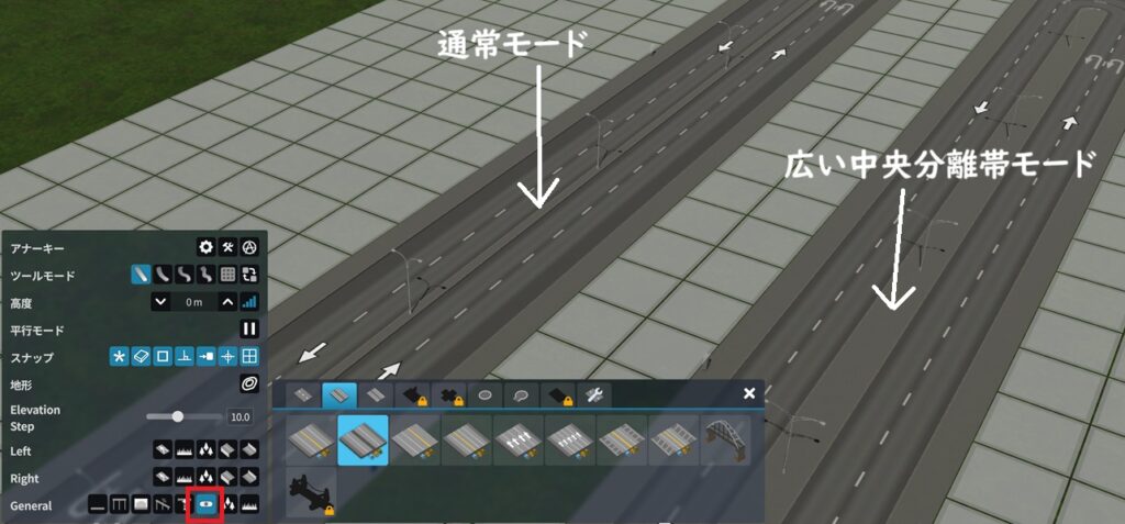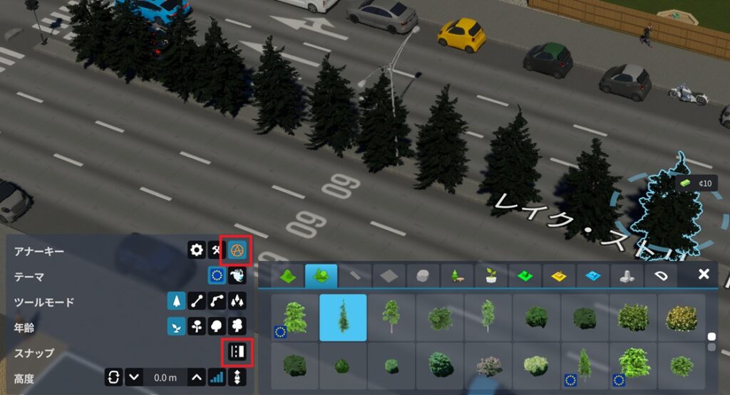道路の街路樹の密度を増やしたいときは、道路にスナップを外してアナーキーを有効にする。この状態であれば、中央分離帯に好きなだけ樹木を植えることができる