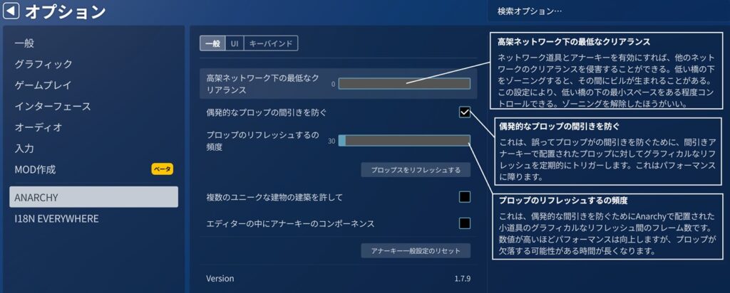 アナーキーを利用して通常なら設置できない場所に小物(プロップ)を配置したとき、ゲーム内の時間が進むといつの間にか小物が消失することがある。この消失現象を止めるための設定。ただし、完全に止めることはできないよう。