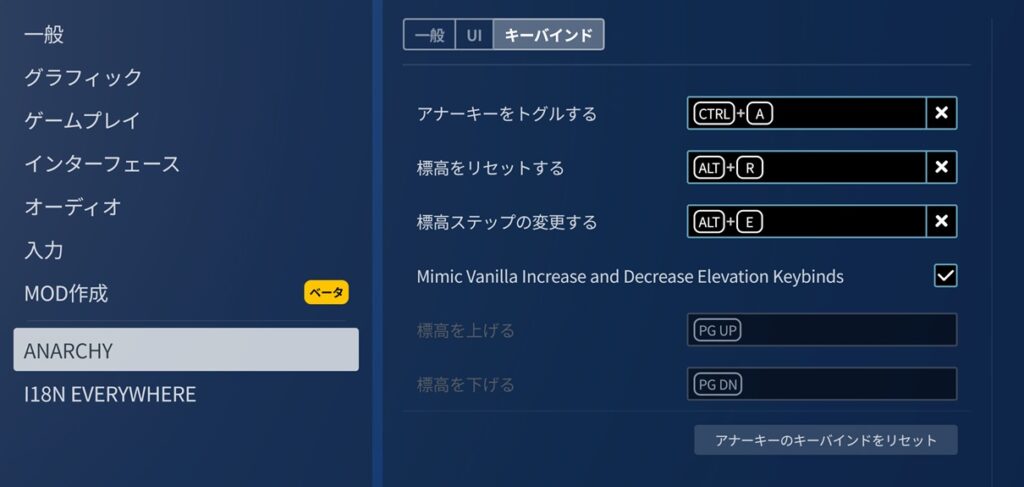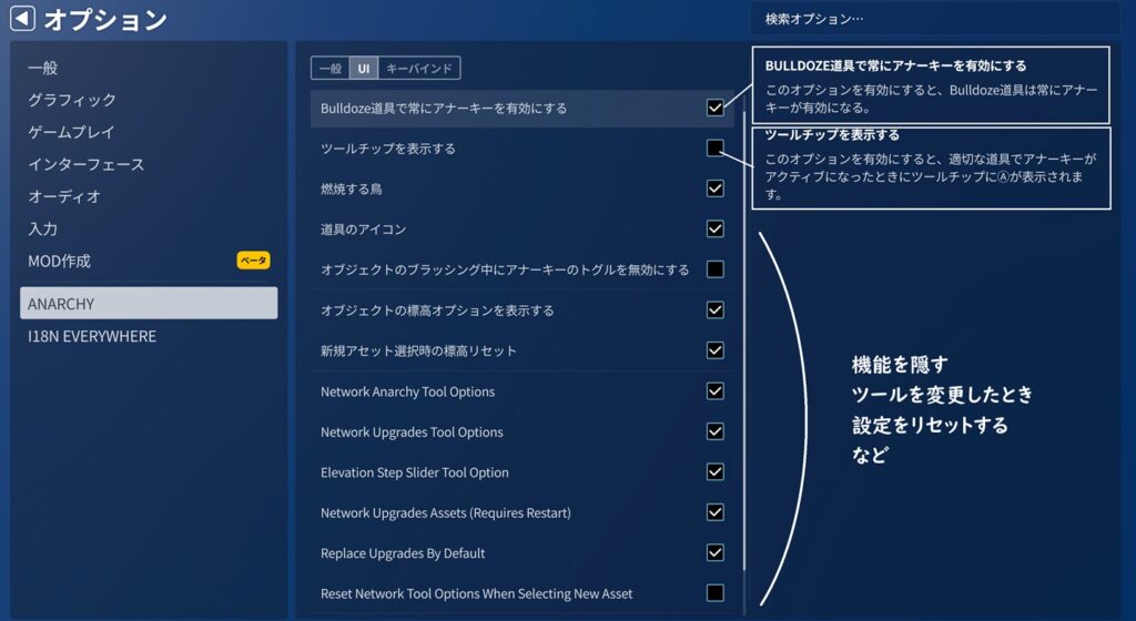 UI関連の設定もある。基本的には初期設定のままで問題ない。「ツールチップを表示する」にチェックを入れると、アナーキーが有効の場合にアナーキーのマークが出るので便利