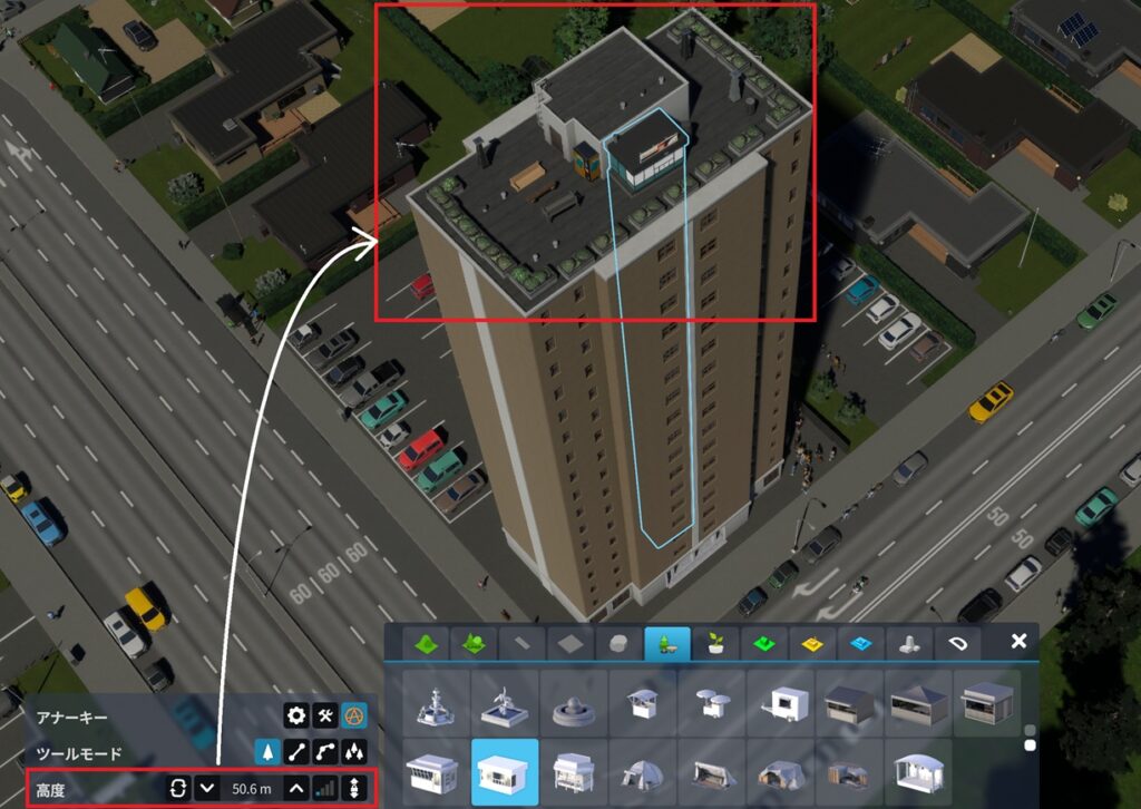 屋上などに小物を配置を配置するときは、高度の設定をすることで高い位置にも配置が可能。