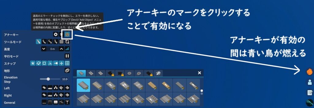 基本的な操作は単純。アナーキーのマークをクリックすると、マークがオレンジ色に変わる。マークがオレンジ(青い鳥がオレンジ)になっているということは、アナーキーも有効になっている。この状態では、建築に一切の制限がかからないので、自由に建築することが可能。アナーキーをオフにしたい場合は、もう一度アナーキーのマークをクリックする。
