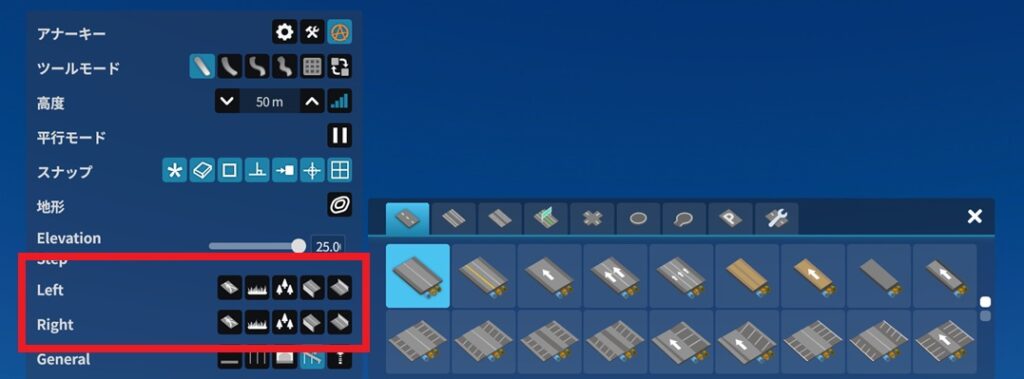 道路を選択したときに、「Right」と「Left」の設定項目がある。それぞれ、道路の向かって右側と左側の設定を変更でき